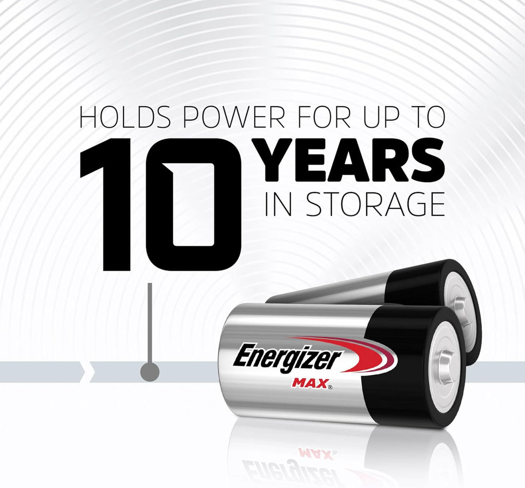 Long-lasting power and innovation is what the Energizer Max family is all about. Energizer C batteries hold power for up to 10 years while in storage, so you have power when you need it most. When it comes to toys, digital cameras, and other valuable devices, you can feel confident knowing you have the long-lasting power and protection you expect from Energizer. Even fully used AA and AAA sizes are designed to protect your devices from leakage - for up to 2 years.